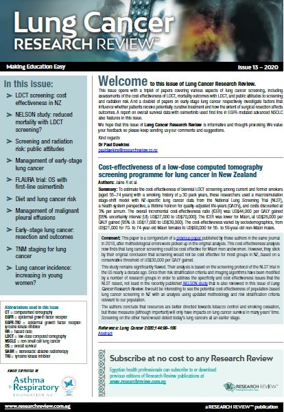 This review will bring you some of the most significant published research on lung cancer from around the world. Each issue contains an independent selection of papers chosen by medical specialists discussing what is relevant and how it can potentially influence current practice.