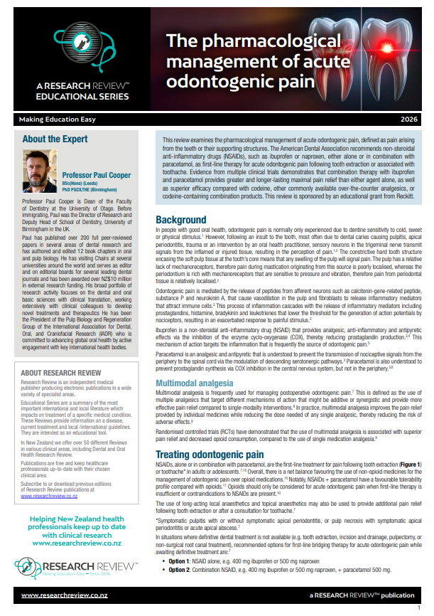 This review examines the pharmacological management of acute odontogenic pain, defined as pain arising from the teeth or their supporting structures. The American Dental Association recommends non-steroidal anti-inflammatory drugs (NSAIDs), such as ibuprofen or naproxen, either alone or in combination with paracetamol, as first-line therapy for acute odontogenic pain following tooth extraction or associated with toothache. Evidence from multiple clinical trials demonstrates that combination therapy with ibuprofen and paracetamol provides greater and longer-lasting maximal pain relief than either agent alone, as well as superior efficacy compared with codeine, other commonly available over-the-counter analgesics, or codeine-containing combination products.