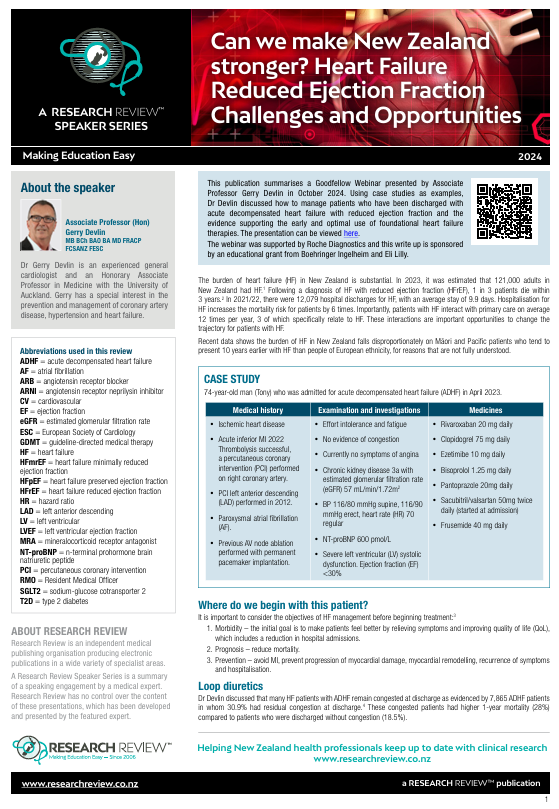 This publication summarises a Goodfellow Webinar presented by Associate Professor Gerry Devlin in October 2024. Using case studies as examples, Dr Devlin discussed how to manage patients who have been discharged with acute decompensated heart failure with reduced ejection fraction and the evidence supporting the early and optimal use of foundational heart failure therapies. The presentation can be viewed here. The webinar was supported by Roche Diagnostics and this write up is sponsored by an educational grant from Boehringer Ingelheim and Eli Lilly.