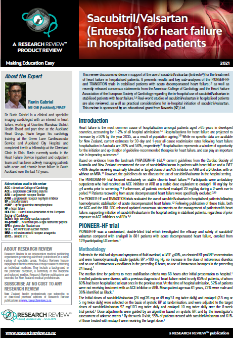 This review discusses evidence in support of the use of sacubitril/valsartan (Entresto®) for the treatment of heart failure in hospitalised patients. It presents results and key sub-analyses of the PIONEER-HF and TRANSITION trials in stabilised patients with acute decompensated heart failure, as well as recently released consensus statements from the American College of Cardiology and the Heart Failure Association of the European Society of Cardiology regarding the in-hospital use of sacubitril/valsartan in stabilised patients with heart failure. Real-world studies of sacubitril/valsartan in hospitalised patients are also reviewed, as well as practical considerations for in-hospital initiation of sacubitril/valsartan. This review is sponsored by an educational grant from Novartis (NZ) Ltd.