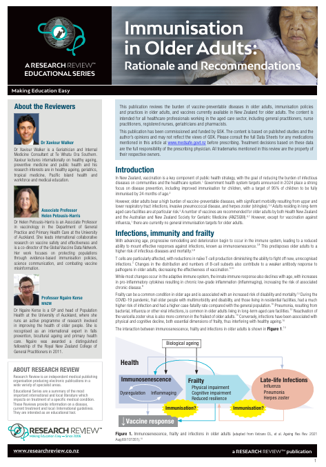 This publication reviews the burden of vaccine-preventable diseases in older adults, immunisation policies and practices in older adults, and vaccines currently available in New Zealand for older adults. The content is intended for all healthcare professionals working in the aged care sector, including general practitioners, nurse practitioners, registered nurses, geriatricians and pharmacists.