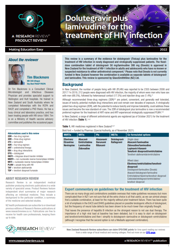 This review is a summary of the evidence for dolutegravir (Tivicay) plus lamivudine for the treatment of HIV infection in newly diagnosed and virologically suppressed patients. The fixeddose combination tablet of dolutegravir 50 mg/lamivudine 300 mg (Dovato) is approved in New Zealand for the treatment of HIV-1 infection in adults and adolescents who have no known or suspected resistance to either antiretroviral component.1 Please note that Dovato is not currently funded in New Zealand however the combination is available as separate tablets of dolutegravir and lamivudine. This review is sponsored by GlaxoSmithKline (NZ) Ltd.