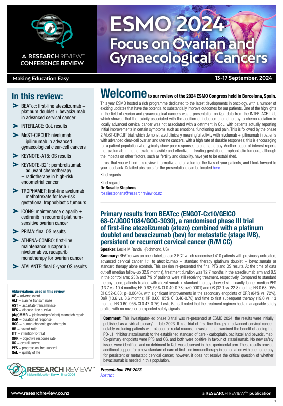 - BEATcc: first-line atezolizumab + platinum doublet + bevacizumab in advanced cervical cancer