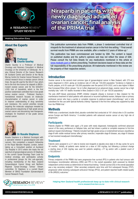 This publication summarises data from PRIMA, a phase 3 randomised controlled trial of niraparib for the treatment of advanced ovarian cancer in the first-line setting. Final overall survival results from PRIMA are now available, after a median 6.2 years of follow-up.