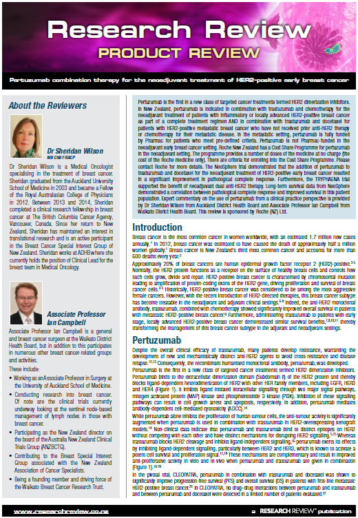 Pertuzumab is the first in a new class of targeted cancer treatments termed HER2 dimerization inhibitors.In New Zealand, pertuzumab is indicated in combination with trastuzumab and chemotherapy for the neoadjuvant treatment of patients with inflammatory or locally advanced HER2-positive breast cancer as part of a complete treatment regimen AND in combination with trastuzumab and docetaxel for patients with HER2-positive metastatic breast cancer who have not received prior anti-HER2 therapy or chemotherapy for their metastatic disease.