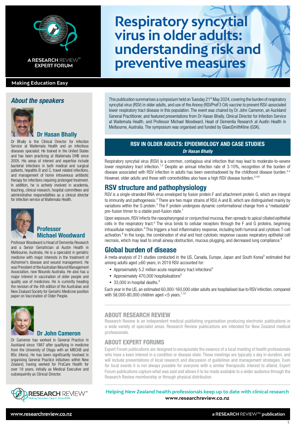 This publication summarises a symposium held on Tuesday 21st May 2024, covering the burden of respiratory syncytial virus (RSV) in older adults, and use of the Arexvy (RSVPreF3 OA) vaccine to prevent RSV-associated lower respiratory tract disease in this population. The event was chaired by Dr John Cameron, an Auckland General Practitioner, and featured presentations from Dr Hasan Bhally, Clinical Director for Infection Service at Waitemata Health, and Professor Michael Woodward, Head of Dementia Research at Austin Health in Melbourne, Australia. The symposium was organised and funded by GlaxoSmithKline (GSK).