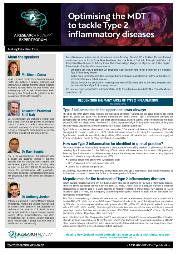 This publication summarises a live educational event held on Thursday 17th July 2025 in Auckland. The event featured presentations from Ms Nicola Corna, Nurse Practitioner; Associate Professor Salil Nair, Rhinologist and Endoscopic Anterior Skull Base Surgeon; Dr Anthony Jordan, Clinical Immunologist, Allergist and Physician; and Dr Ravi Suppiah, Rheumatologist. Objectives of the session were to: