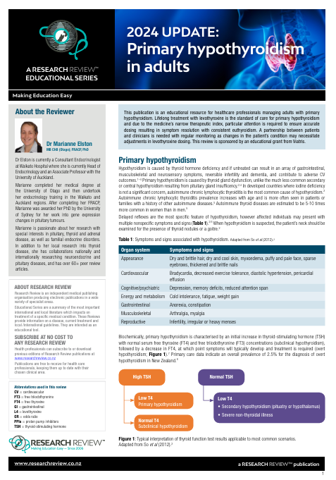 This publication is an educational resource for healthcare professionals managing adults with primary hypothyroidism. Lifelong treatment with levothyroxine is the standard of care for primary hypothyroidism and due to the medicine’s narrow therapeutic index, particular attention is required to ensure accurate dosing resulting in symptom resolution with consistent euthyroidism. A partnership between patients and clinicians is needed with regular monitoring as changes in the patient’s condition may necessitate adjustments in levothyroxine dosing. This review is sponsored by an educational grant from Viatris.