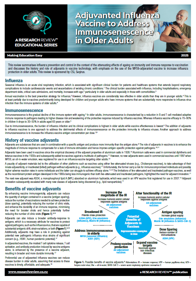 This review summarises influenza prevention and control in the context of the attenuating effects of ageing on immunity and immune response to vaccination and discusses the history and role of adjuvants in vaccine technology, with emphasis on the use of the MF59-adjuvanted vaccine to increase influenza protection in older adults. This review is sponsored by CSL Seqirus.