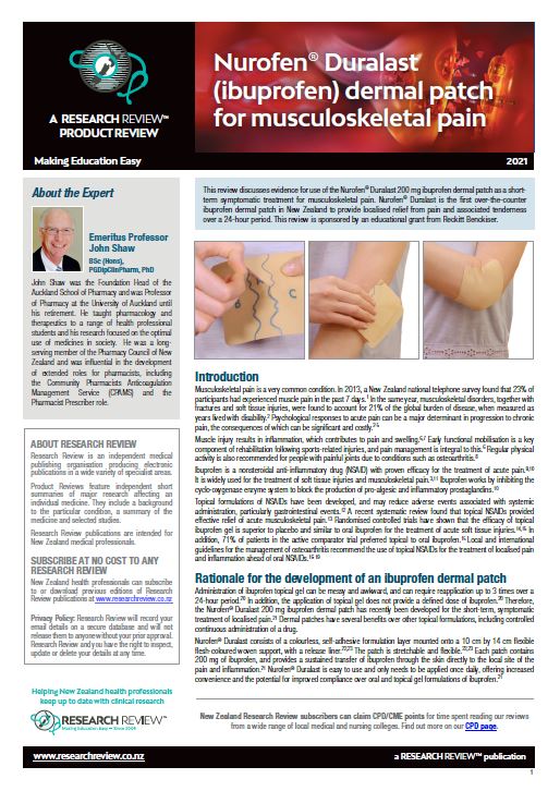 This review discusses evidence for use of the Nurofen® Duralast 200 mg ibuprofen dermal patch as a shortterm symptomatic treatment for musculoskeletal pain. Nurofen® Duralast is the first over-the-counter ibuprofen dermal patch in New Zealand to provide localised relief from pain and associated tenderness over a 24-hour period. This review is sponsored by an educational grant from Reckitt Benckiser.